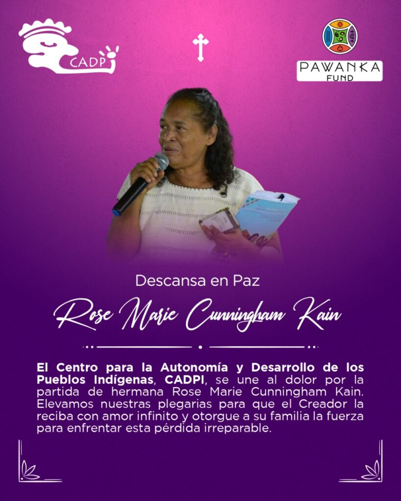 Hoy honramos la vida y el legado de Rose Cunningham Kain, una extraordinaria lideresa indígena miskita de la Costa Atlántica Norte de Nicaragua, quien dedicó su vida a la defensa de su pueblo, de sus territorios y de los derechos de las mujeres indígenas en el mundo.